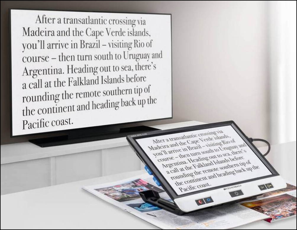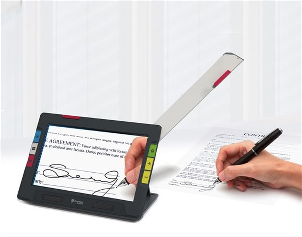 Lekka i kompaktowa lupa elektroniczna z wyświetlaczem HD, idealna do podróży i użytku w domu. Posiada składaną rączkę, która może pełnić funkcję podstawki, ułatwiając zarówno czytanie, jak i pisanie dla osób ze słabowidzeniem. Wyposażona jest w 5-calowy kolorowy wyświetlacz HD z funkcją auto-focus, powiększenie od 2x do 22x oraz 12 różnych trybów kolorów. Możliwe jest także wyjście TV, umożliwiające wyświetlanie powiększonych obrazów na telewizorze. Żywotność baterii wynosi ponad 3 godziny ciągłej pracy po jednym pełnym naładowaniu.